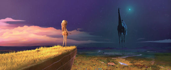 这部动画电影最吸引我的,是它充满想象力和浪漫气息的故事背景设定,以及用画面展现出来的精彩视觉奇观。黑夜与白昼交替,形成了欣欣向荣的世界。而带来日夜更迭的,是由巨型锁链牵引的太阳和由神兽牵引的月亮。太阳和月亮像热气球一样被牵引着,并分别拥有各自的守护者——索宏和缪恩。