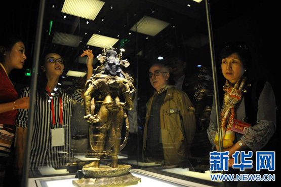9月12日,观众在珍宝馆观看布达拉宫精品文物展上展出的唐卡。 当日,布达拉宫精品文物展在拉萨布达拉宫脚下的珍宝馆开幕,105件展品是从数以万计的宫藏稀世珍宝中甄选的精品文物,绝大多数是首次与世人见面。 作为第三届中国西藏旅游文化国际博览会第二分会场的展览展示部分,本次展出的105件文物包括唐卡、造像、法器、瓷器、玉器、料器等,大部分属于一级文物,承载了丰厚的历史文化信息。 (晋美多吉 摄)