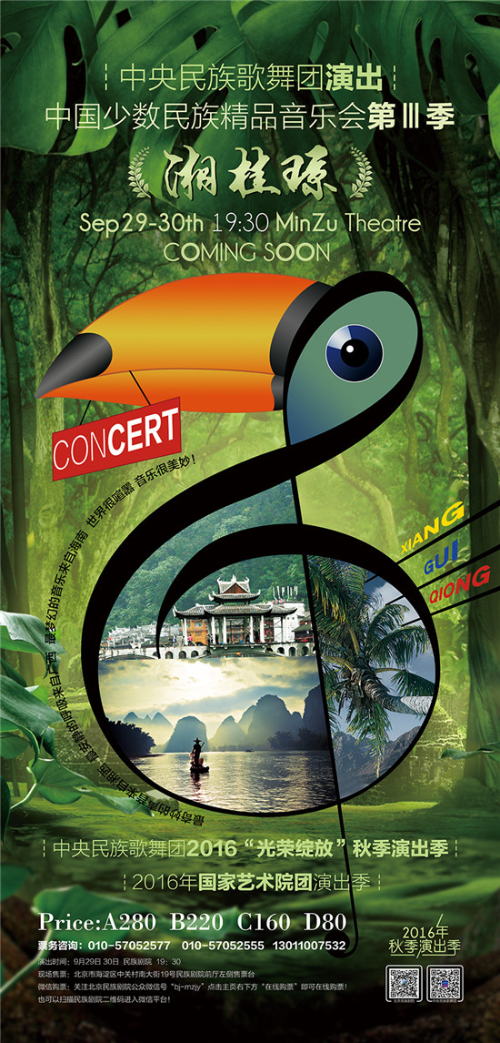国庆来临之前,中央民族歌舞团的艺术家将以今年春季去湖南、海南、广西采集到的多民族音乐素材而创作的一台音乐会《湘桂琼》献给祖国。这台音乐会集苗、土家、黎、瑶、壮、京等少数民族音乐,既有各民族自己独特的音乐符号,又有民族之间交融而产生的“中华民族一家亲”共生艺术感觉。音乐会将有一部分原生态艺术家带来首都观众很少看到的鼻箫、打叮咚、打溜子、咚咚奎等特有的少数民族音乐节目,更有生灵活现的“猴鼓”等精彩表演。
