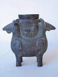 双羊尊筒形口,腹为双羊前躯相背状。羊角大弯曲,尊口下饰弦纹和龙面饕餮纹,较为罕见。羊颌下及腹下饰扉棱,象征须和腹部垂毛。饰龙面纹,腹饰鳞纹,腿饰龙纹。1860年“火烧圆明园”后被掠夺并流失海外。