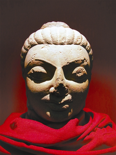 展览中的这尊阿育王像头部有高大的肉髻,发髻作起伏的圆丘状和翻转的云纹状,高鼻深目,头部最显著的特征是自鼻孔下向两侧生长的小胡子。在印度造像展厅中有一尊来自于北方邦马图拉的5世纪佛头(图4),也表现有相同的小胡子,这是印度人典型特征之一,据此可知两者之间应存在某种内在关联。这尊阿育王像着通肩式袈裟,袈裟衣纹表现为凸起的尖棱线状,与同地区出土的着褒衣博带式袈裟佛像存在明显差异。袈裟胸部衣纹和腹部以下衣纹各自成组,均为同心的U字形自小而大的扩散。这种衣纹线的空间构成关系,与前述的马图拉佛立像有一定的相似之处,只是后者胸腹部及以下衣纹并未分为两组表现。