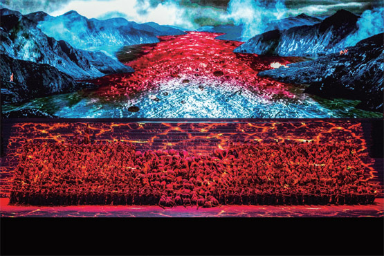 这段历史,也是晚会歌颂的一个重要部分,在《革命理想高于天》这一篇章中,《过雪山草地》《沼泽》和《活着走出草地》等节目都很成功地把沼泽草地的恶劣和红军将士的英勇顽强的鲜明对比刻画出来。只见那巨大的道具搭建起逼真的沼泽地,那一幕幕眼看战友陷入沼泽但是无法成功挽救的场景紧紧地抓住每一位观众的心,再加上演员们精湛的表演与逼真的舞台效果,更是将当年无情草地吞噬红军疲惫之师的情景,让观众即使没亲身经历也无法不生发悲痛和惋惜,无不为红军将士面对死亡、痛苦毫不畏惧的大无畏精神所动容。当屏幕定格在红军部队历经千辛万苦终于走出草地的那一幕时,整个会场笼罩在排山倒海的掌声和惊叹声中!