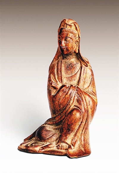 海口市博物馆藏的这件现代沉香木雕观音像,观音呈半跏趺坐式,弯月眉,白毫位于两眉之间,双目微启,面容安详,姿态生动传神。双手附于胸腹之间,似握有一卷经书,赤足,盘腿曲肱而坐。人物肌圆骨润,身披长衫,衣袖宽肥,长裙曳地,衣褶纹饰雕刻流畅,造型优美,显示出女性的柔美。雕像木质细腻,肌理还有少量的油线分布。