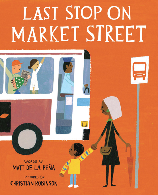 《市场街的最后一站》的文字作者为拉丁裔作家马特·德拉·佩纳,图画作者为非裔画家克里斯蒂安·鲁滨逊。而无论从作者的文化渊源,还是作品的面貌来看,这本书都体现了美国儿童文学对族群、阶层融合的理解。一方面,这本书具有非裔图画书的基因。儿童与非裔传统的联系,主要体现在男孩C.J.的肤色,及与长者娜娜的关系上。在书中,有着明显的非裔肤色的长者娜娜是作为陪伴儿童、与儿童对话的形象之一出现的。通过对话,娜娜总是能将男孩C.J.对于现实的描述、感触提升到一个更为深邃、久远的层面。比如在等待公交车的时候,C.J.就很羡慕拥有私家车的家庭,而后文对公交车上充溢着互相欣赏、互相关爱气氛的场景的描绘,正是对前文C.J.现实欲望的回应,同时也是对阶层差异的回应。公交车上的人们,也并非都是来自非裔族群,也有白人。各种体貌特征和爱好的人们,将这本图画书的意义拓展到了非裔族群之外,进入了一个多阶层的、多元文化的、多元族群的语境。