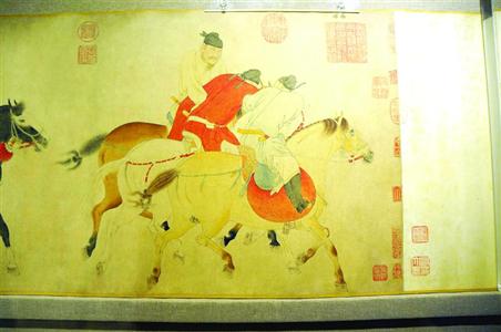 《五王醉归图卷》创作于元代,但用的是宋代纸本,长达2.12米,刻画了唐玄宗五兄弟在一起骑马游玩的场景。