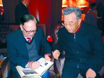 2012年,在文化部,贾作光(左)为高莽在《新中国早期文化交流口述记录》一书的书页上签字。