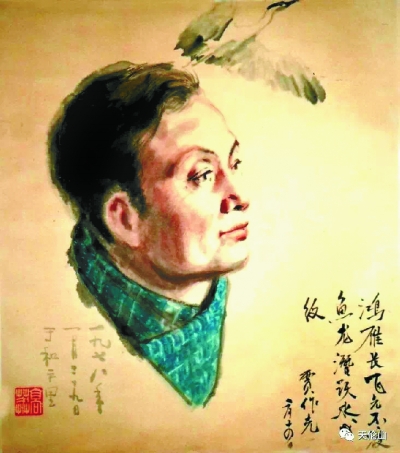 高莽画贾作光像。作于1978年1月29日。贾作光在画上题诗:“鸿雁长飞光不度,鱼龙潜跃水成纹(文)”。