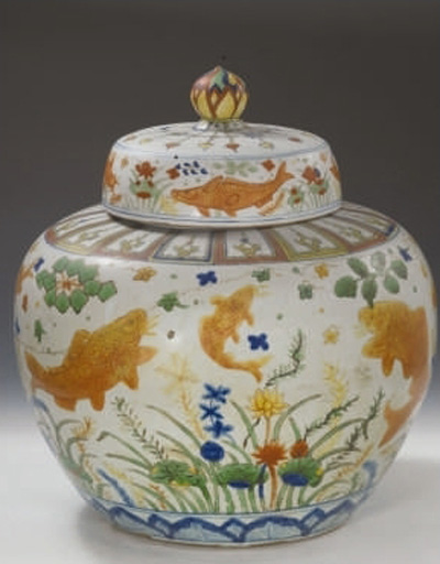 天津博物馆藏明代《嘉靖款五彩鱼藻纹盖罐》
