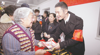 2015年11月,黄晓明在天津为老人发放黄手环