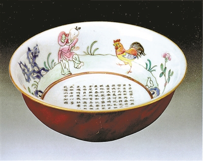 此外,一件清代初期的青花瓷罐,罐身上画有牡丹,花丛中有两只雉鸡相互顾盼。画法工整、传神。牡丹以雍容富丽的花姿号称百花之王,寓意富贵;鸡与“吉”谐音,有吉祥之意。另一件延庆出土的清代粉彩斗鸡碗,雄鸡迈步向前,黑色尾羽翘张开来,后跟一雏鸡,前面一童子作邀斗状。红色鸡冠、黄色鸡喙、黑色鸡尾、蓝色鸡翅,都点缀得恰到好处。虽为斗鸡,但毫无紧张之气,而是其乐融融。