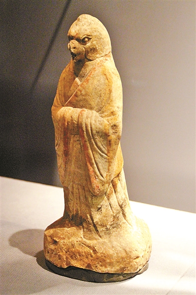 顺义木林镇安辛庄辽代墓葬出土的酱釉猴纽盖鸡冠壶,形体浑圆。壶面四周边沿饰有仿皮革缝合针脚的圆点纹,上部为模仿皮条装饰的垂弧纹、垂带纹。一只小猴坐于盖上双手作揖,活泼俏皮,憨态可掬。不知这是否代表了一种意思上的“申猴酉鸡”?