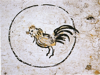 墓室西侧的鸡,与十二生肖中的“酉”位相对。身体轮廓的颜色为黑彩,内填黄彩,高约25厘米。寥寥数笔,但很传神。它双脚直立,头前倾,尾翼展开。雄赳赳,气昂昂,斗志昂扬,似乎拉开架势准备大干一场。实际上,古人很早就注意到公鸡的好斗习性。《战国策》中记载,齐国都城临淄其民无不吹竽、鼓瑟、击筑、弹琴、斗鸡、走犬。斗鸡,至少在两千多年前就已经成为人们的一种娱乐方式。