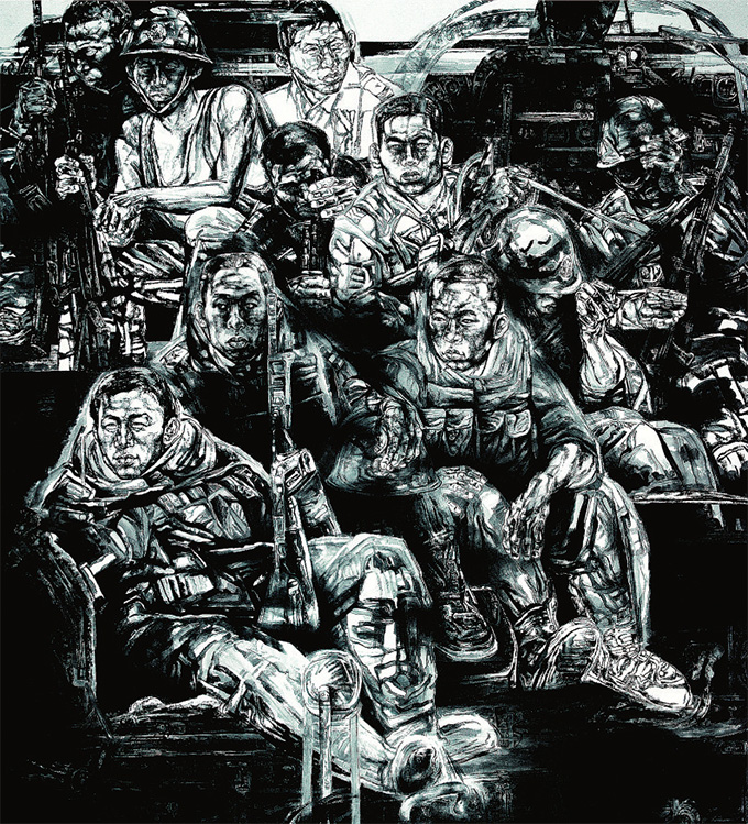 我们尽可以把李连志这一类的画作视为“职务绘制”,说拉扯点儿叫“命题作文”,行为指向有某种“被动性”,但是,“故事还是老故事,我们可以有新鲜的嘴唇”,所以,依然还是那个老得直掉渣的军旅题材,一旦遭逢了一番新异的“讲述”,境况和局面就大为不同了,《锋时代·预备》《绿林》《军营之歌》《冰冻三尺》《海训》《兵器》《美人蕉》等一系列表现军人生活和形象的作品,可谓是倾尽墨色打江山,江山如此多娇,为此类铺天盖地的作品打了个样儿,同时也占有了属于他自己的艺术高地。