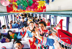 新疆56个民族代表同乘“民族团结一家亲号”列车,车厢似欢乐的海洋。吴卓胜 摄