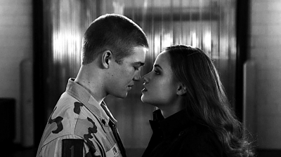 赛场这一段响起的音乐代表着荣誉、集体,但浮现在比利脑海中的却是个人而且抒情的画面,长镜头里面的菲迅穿着居家服,而不是星条旗队服,她此时不是那个象征着集体的啦啦队员,自然也不会用老套的英雄主义劝说比利返回凶险的战场。