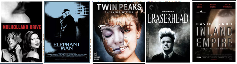 《穆赫兰道》电影海报、 《象人》电影海报、 《双峰》电影海报、 《橡皮头》电影海报、 《内陆帝国》电影海报