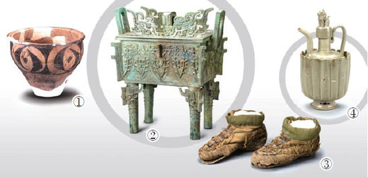 图①:河南三门峡庙底沟遗址出土的彩陶。 图②:湖北随州叶家山曾侯墓地出土的方鼎。 图③:新疆精绝贵族墓地出土的钩花皮鞋。 图④:陕西吕氏家族墓出土的青釉兽形盖、带温砵执壶。 制图:张芳曼