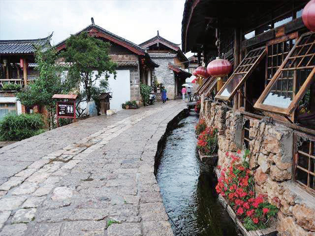 水渠两岸,沿街道满是小商店、饭馆、茶坊等。街道为青石板铺就,被岁月的脚步踩踏得光溜溜的,或凹进去,或鼓起来,面团似的。各种各样的店铺悠闲地分布在街道两旁,商品琳琅满目。手工编织的藏式披肩,做工精细,花色多样。姑娘们一边编织,一边展示销售。银匠丁丁当当地敲打着,现做现卖,货真价实。水渠临窗而过,过渠的桥板黯然。渠水是饭馆的天然冰箱,一箱箱啤酒放在水中自然冷镇着。渠道边的茶坊蛮有情趣。临渠而坐,品着茶,数着渠水里的鱼儿,听着对座弹奏琵琶,如清爽的水波在心壁荡漾。