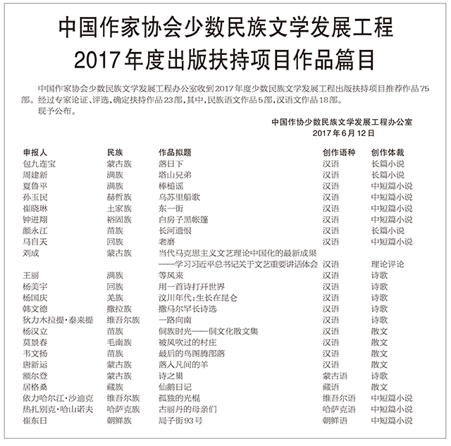 中国作家协会少数民族文学发展工程办公室收到2017年度少数民族文学发展工程出版扶持项目推荐作品75部。经过专家论证、评选,确定扶持作品23部,其中,民族语文作品5部,汉语文作品18部。