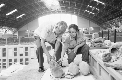 许卫红(右)和袁仲一在秦始皇兵马俑一号坑。 资料图片