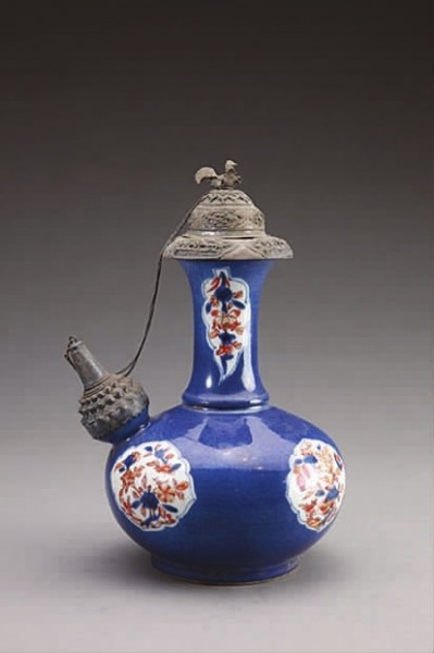 故宫藏蓝地开光折枝花纹军持。“军持”本为印度佛教徒饮水、净手或饭后漱口使用的器皿,汉代以来随佛教传入中国。日后它逐渐变成一般的生活器具,多销往东南亚地区。为了防止器物口、流的残缺和使用的方便,这类瓷器往往进行了一些装饰性加工,在其口、流或执柄等处镶嵌上錾刻花纹的金、银、铜制装饰,有的则在壶的口部加装金属盖子,并在盖与执柄之间连接金属链条,防止壶盖掉落,实用与美观相结合,具有异域风情。