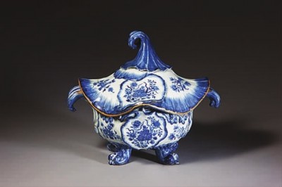 故宫藏清雍正青花叶纹开光花卉纹双耳带盖汤盆。这是为适应欧洲人饮食习惯而特制的器皿,系欧洲国家定烧之物。