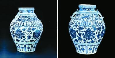 元,青花缠枝牡丹纹摩羯鱼耳大罐。
