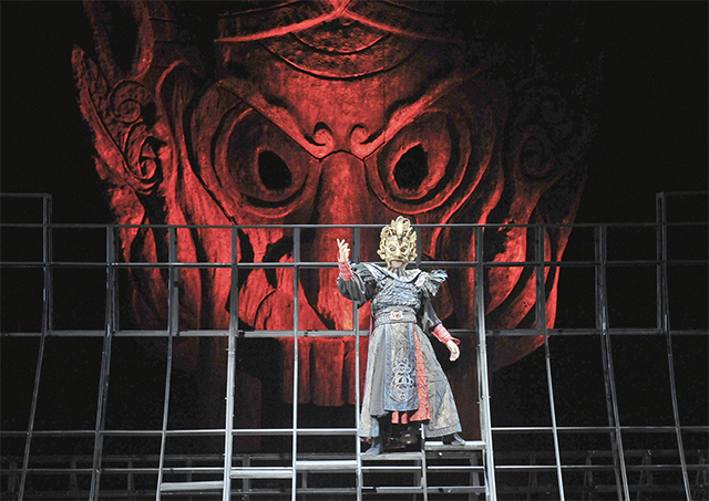 王晓鹰长期致力于“中国式舞台意象的现代表达”,其中有一个重要的观念,即所谓“中国意象”是“在中国传统文化艺术的元素、手法、意境、美感基础之上的整体性的舞台意象”,而且往往“由意象化场面和意象化表演结构而成”。这种揉碎后化入的、把场面和表演的流动序列概括进来的整体观,相比于一些草率的元素拼贴与堆叠,显然要高明很多。有一种观点,曾对王晓鹰“过多”运用中国元素特别是戏曲元素表达过不满,但我看重并理解这个过程的不易,以及他要抵达的那个目标。话剧《兰陵王》的呈现当然还有不足,比如戏曲味道的锣鼓偏燥,音响缺乏幽微曲折与铿锵凌厉的对比;兰陵王领军冲杀,此时不管是基于人偶化或是戏曲化的表演,节奏也显得过于平缓松弛,演员完成度有限。但是,从王晓鹰整体的“中国意象”表达看,我以为已愈加接近他的目标,只是可以更加精细化。