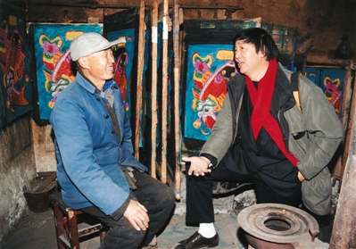 冯骥才(右)在普查中发现了天津杨柳青镇南宫庄子唯一活态的“粗活”年画艺人王学勤(左)。