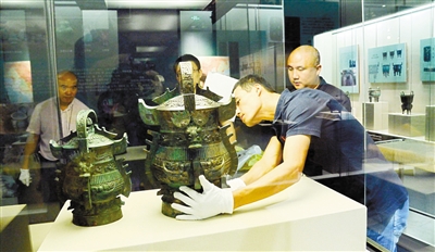 “展品涵盖了新中国成立以来历次重要的考古发现,诸如眉县杨家村窖藏、扶风五郡西村窖藏、石鼓山西周墓等近十几年来的新发现也都悉数登场。这些青铜器造型奇特、纹饰华丽、工艺复杂、铭文丰富,代表了西周青铜文明的最高成就。”郭学雷表示,此次亮相的商周青铜器大多出土自陕西宝鸡。他说,宝鸡,地处陕西关中平原西端,是西周的发祥地和畿辅要枢,青铜文化遗存极为丰富,被誉为“中国青铜器之乡”。自西汉年间的“尸臣鼎”到晚清的“四大国宝”——毛公鼎、大盂鼎、散氏盘、虢季子白盘,两千年来,宝鸡出土了数以万计的青铜器。新中国成立以来,宝鸡发现的青铜器更是令世人瞩目,诸如西周初年的重器何尊,史籍失载的国青铜器以及岐山董家、扶风庄白、眉县杨家村青铜器窖藏,都极大地震撼了世人对西周历史的认知。2012年以来,宝鸡石鼓山又相继发现了一批重要的商周墓葬,其中出土了不少罕见甚至是首次发现的青铜珍品,被评为2013年度“全国十大考古新发现”之一。