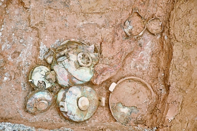 此次发掘的两墓墓葬形制均为口大底小的竖穴土坑墓,平面呈长方形,东西向。在M4墓室的棺内发现人骨一具,保存状况较差,仅存牙齿数颗。出土的器物有陶、铜、金、漆、石、骨器等。其中,陶器有高领折肩壶2件、侈口小罐1件,铜器有带盖鼎2件、带盖豆2件,舟、盘、匜各1件,铜盘之下放置2件车軎,铜舟下出土金箔1片,另有石圭1组、骨管1件、祭骨1具(应为狗)。M6墓室内的葬具为一椁两棺,人骨保存较差,但出土的器物非常全面,有陶、铜、金、玉等各类器物150余件。其中,随葬铜容器21件,铜编钟一组9件,石编磬一组10件;陶器6件;铜兵器有戈、剑、镞;还有车軎、铃、马衔等车马器,凿、锛类铜工具,漆器、金饰、石圭、玉圭、玉饰及各类贝串饰等。