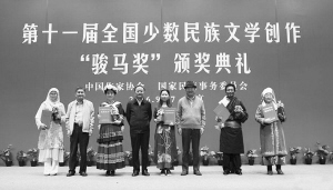2016年9月27日,第十一届全国少数民族文学创作“骏马奖”颁奖典礼上,国家民委副主任李昌平(左四)为中短篇小说奖获奖者颁奖。 资料图片