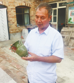李和平展示自家瓷坊里烧制的青釉刻花执壶