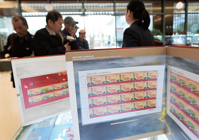 十月十八日,中国邮政发行《中国共产党第十九次全国代表大会》纪念邮票一套两枚,小型张一枚。图为南京市民在中国集邮专卖店购买纪念邮品。 新华社记者 孙 参 摄