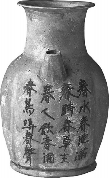 据周世荣先生的考证和其他学者的初步清理,已经发现的62首完整的瓷器题诗中,见于《全唐诗》和《全唐诗续补遗》者共九首,见于其他传世文献者一首,另外可确定的先唐诗一首;其余大多是当时流行的民间诗歌或窑工们的即兴创作。也就是说,当年的窑工中有相当一部分人不仅识文断字,还会写诗。他们不需要像文人那样拘泥于诗学理论,不需要咬文嚼字去推敲,就是在和泥拉胚或添柴烧火之际,自己心一动,想到什么顺手写下来,刻在那些器物上:“天地平如水,王道自然开。家中无学子,官从何处来?”