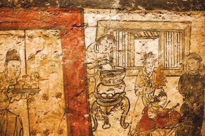 《阳泉东村元墓壁画》出现了刀削面———画中人物正在炉灶前削面,展现山西近千年面食传统。 叶辰亮摄