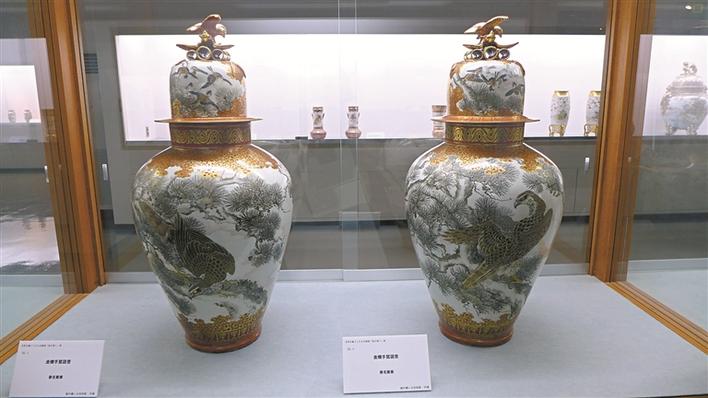 展品中,我注意到有绵野吉二的“金襕手”大瓶和花鸟图香壶等作品。这个绵野吉二很有商业头脑,最初,他在石川县能美郡寺井町制瓷,明治初期看准商机,跑到横滨开了家九谷瓷器专门店,就叫“绵野吉二商店”。他是当年将日本九谷烧推向海外市场和海外博览会的重要推手,而今有故事的“绵野吉二商店”瓷器,已成为收藏界的重要藏品了。