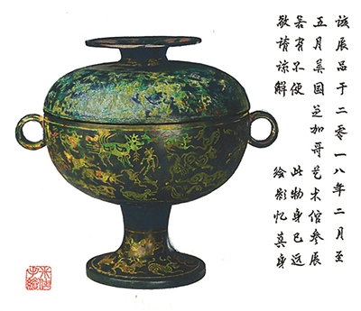 最近,到故宫青铜馆参观的观众会发现,有几个展柜中的文物不见了,取而代之的是一幅幅古色古香、几可乱真的青铜器画像。这画不但可以让观众领略国宝青铜器的风采,旁边还有几行小字说明情况,原来展品2018年2月到5月去美国芝加哥艺术馆参展,所以特此向观众道歉,敬请谅解,而用画代替展品,是为了“此物身已远,绘影忆真身”。