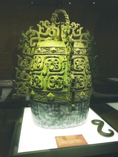 再往前走,看到了一件“秦公钟”和一件“秦公镈”,均由宝鸡青铜器博物馆供展。记者查阅相关资料得知,出土时一共有8件铜器,其中钟5件、镈3件,上面均有铭文。铭文合计135字,据释文,主要是颂扬秦国先祖的业绩。铭文记录到了秦宪公之时,再结合行文的口吻,学界基本推断作器者是宪公之子秦武公。武公征服了周边戎族,使秦国势力达到关中渭水流域。在钟和镈旁,各有一个S型的钩状物。马今洪解释,这个钩状物是挂钟、镈用的。镈敲出的是单音,钟敲出的是双音,钟的敲击点一个在下方的中心位置,一个在右下侧铸有小鸟图案的地方。“有了双音钟,就可以用数量较少的钟构成完整的音阶了。”马今洪说。