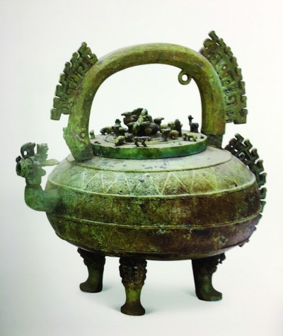 “这个铜盉借调到上海博物馆展出时,我曾经仔细看过,非常有意思。”马老师把我们带到一个中心展柜前,内中展示的是由浙江省博物馆送展的“螭纹提梁铜盉”。定睛看器盖,只觉好似走进了动物园,上面立体地雕塑了犀牛、大象、老虎、熊、鹿等兽类,足有16只。在这些动物四周,堆塑着11条形态似蛇的螭龙,有的正在大快朵颐,有的昂首好似在下咽,有的竖起上身像在寻找猎物。“你看,这条螭龙在吃什么?”见记者似乎迷失在“动物园”中,马老师灵机一动,掏出手机选好角度“咔嚓”一声,而后指着手机屏幕道,“就是这条,你看它在吃什么?”熊建华问:“是不是青蛙?蛇吞蛙的主题很常见。”马老师摇摇头:“你们看,这眼睛瞪得大大的,嘴巴张开,高举双手……这是个人,他的脚已经被螭龙吞啦!”听到这儿,熊建华兴奋起来:“你说,这会不会就是 ‘饕餮纹’的立体形象呀?”