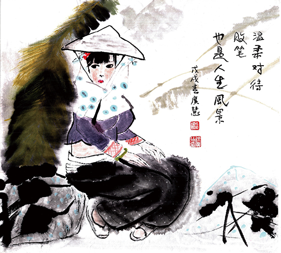我画画有一个毛病,就是一幅画从来不画第二张。铺纸,研墨,提笔,一蹴而就,画成什么算什么,图得就是个痛快。昨天画的另一幅画,一个女孩下楼梯,由于没有把腿的弯度处理好,感觉女孩像个小偷,畏畏缩缩。怎么办呢,左思右想,终于想出了办法,叫女孩改穿裙子。兴奋地把画铺好,唰唰唰,手抖墨落,裙子画成。贴到朋友圈,竟有不少朋友赞叹。得意之余,也有些许的遗憾。心想,现在不是流行镂空的黑纱裙吗?要是不坐实,用薄而透明的墨处理可能会更好。我老师施胜辰的老师是叶浅予先生,有一次我说,老师,您的画和叶先生的真是如出一辙。老师慌忙说,要是和老师画得一模一样可就完了,要画出跟老师不一样的感觉才行。我知道老师所说的不一样就是创新。我也想创新一下,在画里加入自己的东西。可是思想迟到,墨透纸背,这次是无法再改了。于是安慰自己,嘿,这样也很好哇,穿了薄纱裙,就穿不了光滑的黑缎子了。