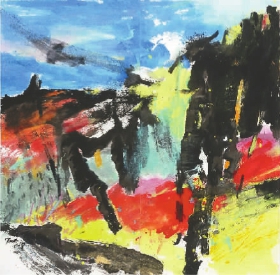 将唐承华的南方韵情系列纳入一种风景的框架中似乎有些勉强,但考虑到“一花一世界”的佛家世界观,我们仍然可以将唐承华极具抽象性的绘画性表达,视为一种个人化的内心风景加以观察。唐承华作品中的现实物象,虽有所本,但高度抽象,在强烈而具有书写性的绘画表面下,反映出由某些强烈的生活信念所引发的生存的张力。作为版画画家的唐承华,他的绘画,总是堆积着厚重的色彩,在与浓重的墨色相互冲击生发,一派霸悍沉郁之气,却又勾勒出明亮的轮廓,让人体验到一种动感。对于唐承华来说,无论他笔下的画面具有多么诗意的色彩,但其内心,总有一种对现实生活的冷静思考。