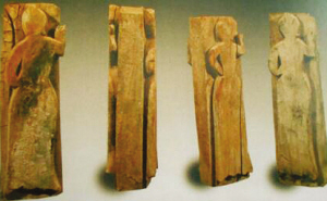 1996年新疆文物考古工作者在民丰县尼雅遗址中发现的一组四件木雕舞蹈人像