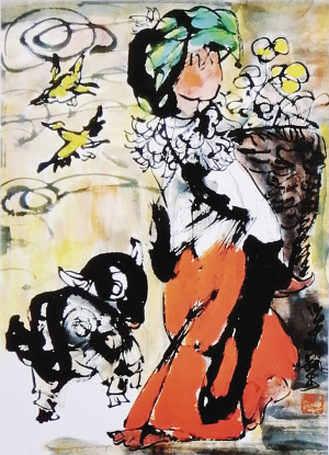 画面上,三三两两的少数民族姑娘在悠闲地玩耍,身边围绕着水牛、山羊和兔子。姑娘们头上随意插着大山里的野花野草,密林深处那些不知名的鸟儿、色彩斑斓的蝴蝶、大大小小的野蜂或站在她们的肩膀上,或飞在空中……画作中大写意的技法、老到的笔触、大胆的用色、夸张的舞姿、天马行空的构图,充满视觉冲击力。尤其是那些以山花野草为霓裳,以山羊、野禽为伙伴的大山姑娘,个个没画眼睛,即便是一笔掠过,也顶多勉强算是闭着眼睛。