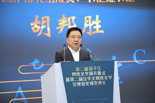 10月29日,第二届扬子江网络文学周开幕式暨第二届泛华文网络文学金键盘奖颁奖典礼在南京江宁东山国际滨河街区举行。中国作协党组成员、书记处书记胡邦胜,江苏省委宣传部副部长徐宁共同启动文学周系列活动。中国作协网络文学中心副主任何弘,江苏省作协党组书记、书记处第一书记、副主席汪兴国,江苏省委统战部副部长黄仕亮,南京市委常委、宣传部部长陈勇,中国作协网络文学研究院副院长肖惊鸿,上海市作协专职副主席、秘书长马文运,江苏省作协一级巡视员王朔,浙江省作协党组副书记、省网络作协主席曹启文,安徽省文联副主席、省作协主席许春樵,以及南京市文联、江宁区委领导等出席开幕式。