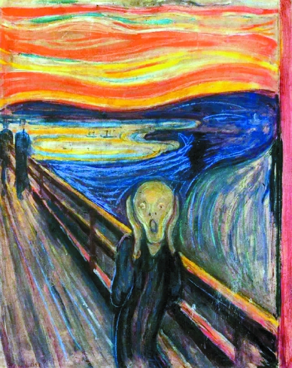 1892年1月22日,正经历人生至暗时刻的蒙克在笔记里以极具诗性的语言描述了这样一个场景:“我与两个朋友走在路上,正是夕阳西下时分,我感到了一丝伤感,天空倏然间变得血红。我停下脚步,倚靠在栏杆上,累得要死,我望向那些如血与剑一般的火红云朵,望向蓝黑的峡湾和城市。朋友们走远了,我还站在那里,因焦虑而战栗。我仿佛听到天地间传来尖叫,那尖叫声响彻寰宇,经久不息。”