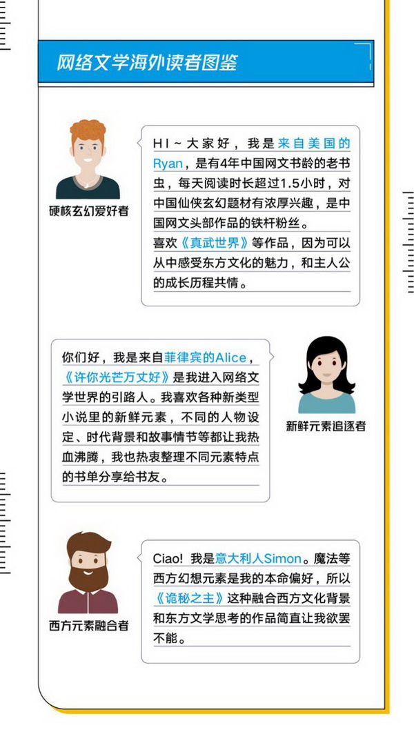 《白皮书》还从用户的阅读习惯和偏好入手,列举了三种典型的海外用户:一种是“硬核玄幻爱好者”,对中国仙侠玄幻类型有浓厚兴趣,是中国网络文学头部作品的忠实读者,喜欢《真武世界》等作品,能从中感受东方文化的魅力,共情主人公成长的历程。一种是“新鲜元素追逐者”,通过《许你光芒万丈好》这样的热门作品进入网络文学的世界,喜欢各种新类型小说里的新鲜元素,如不同的人物设定、时代背景和故事情节等,还会整理不同元素特点的书单分享给书友。还有一种是“西方元素融合者”,本身就喜欢魔法等西方幻想元素,喜欢《诡秘之主》这样融合了西方文化背景和东方文学思考的作品。