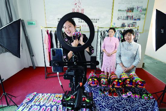 2020年10月9日,从城市返回河南省信阳市东岳村里创业的刘芳(左),带着村民直播销售他们的自创旗袍服装品牌和当地特色手工产品。 居 杨 摄