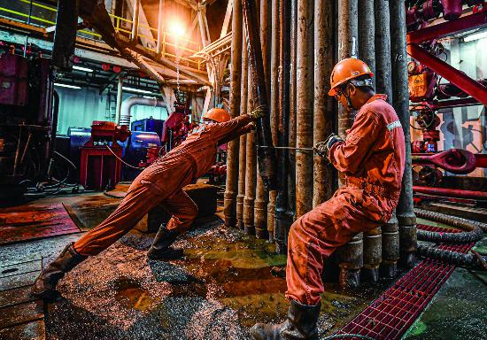 2020年7月26日,在位于南海北部海域的勘探三号钻井平台上,钻井工人在摆放钻杆。 蒲晓旭 摄