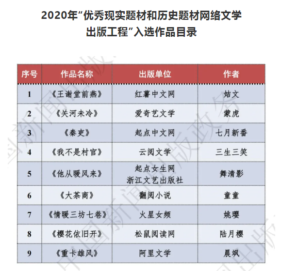国家新闻出版署关于公布2020年“优秀现实题材和历史题材网络文学出版工程”入选作品的通知